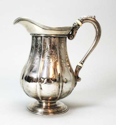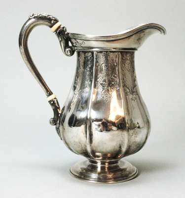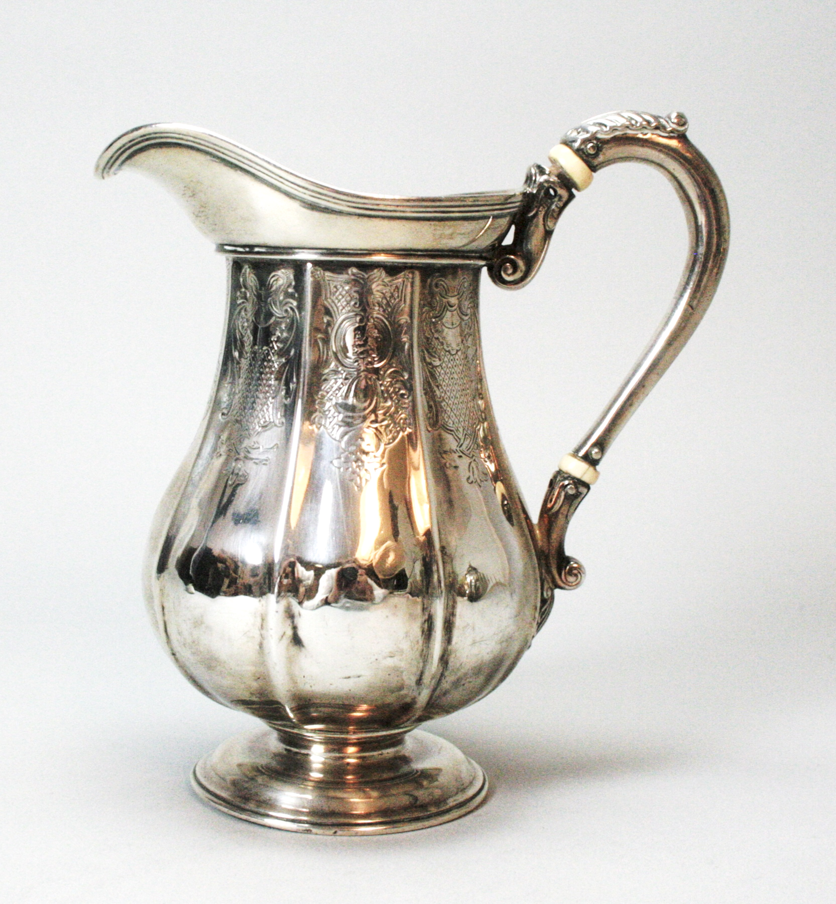 WE, London 1815, of ribbed baluster form with engraved detail throughout, cartouche with crest, to a domed foot with leaf capped handle, together with a associated Victorian cream jug of similar detail (2)