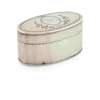 Phipps & Robinson, London 1792, of oval outline, the hinged lid with engraved initials and foliate detail, internal steel grater, the flat base with flush hinged opening