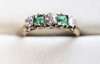 the two square cut emeralds with three circular mixed cut diamonds, all claw set, open gallery, set in unmarked rose coloured metal