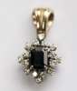 claw set in white metal with a trap cut sapphire in a border of similarly set round cut diamonds, to an unmarked yellow metal bale