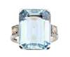 claw set in white metal with a rectangular step cut aquamarine, flanked to each side by a single old cut box set small diamond, the plain white metal shank stamped PLAT