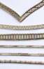 composed of multiple yellow, white and rose gold fancy links, forming a tapering band with concealed clasp and safety clip; together with another composed of textured rectangular multi-coloured gold links, and four others of similar design all stamped 375 or 9CT (6)
