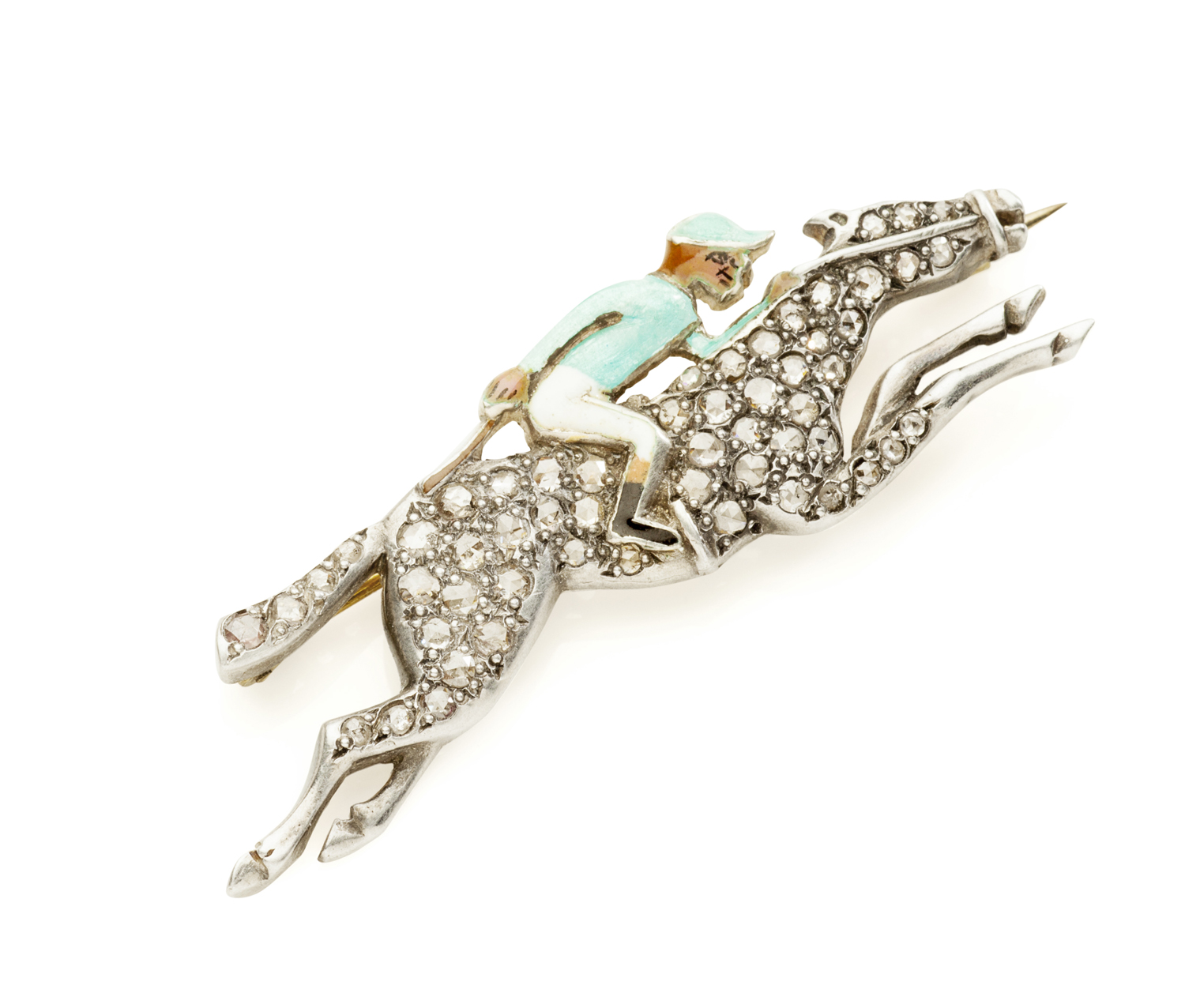 modelled as a race horse and jockey in white metal, the horse set throughout with small rose cut diamonds, the jockey with enamel detail, unmarked