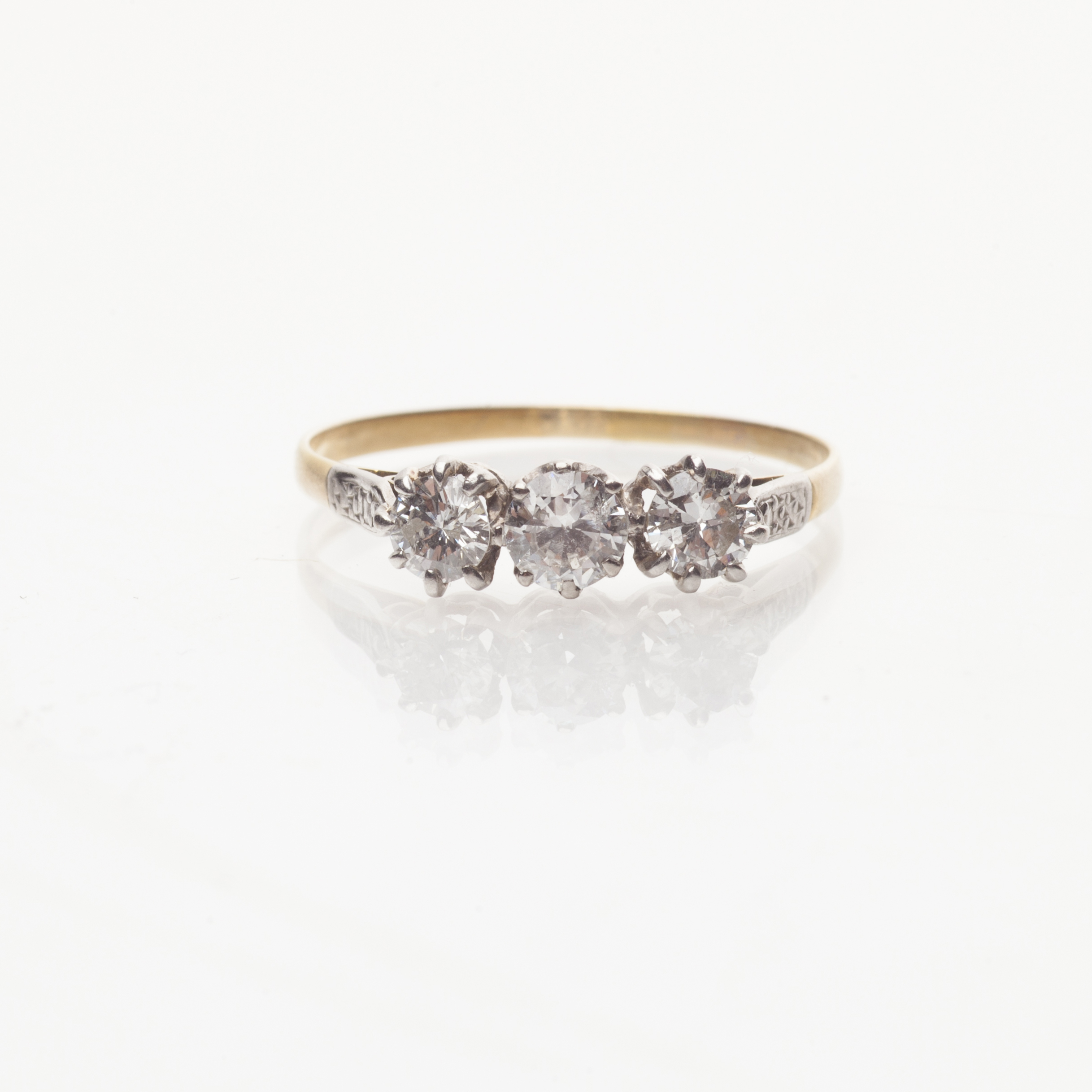 claw set with three graduated round cut diamonds, to a plain unmarked yellow metal shank