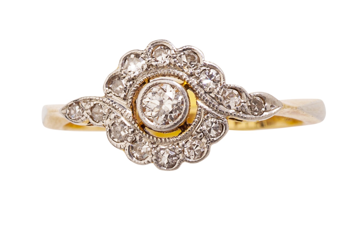 millegrain set with a small round cut diamonds, in a scrolling border of small eight cut diamonds, to a plain yellow metal shank stamped 18ct PLAT