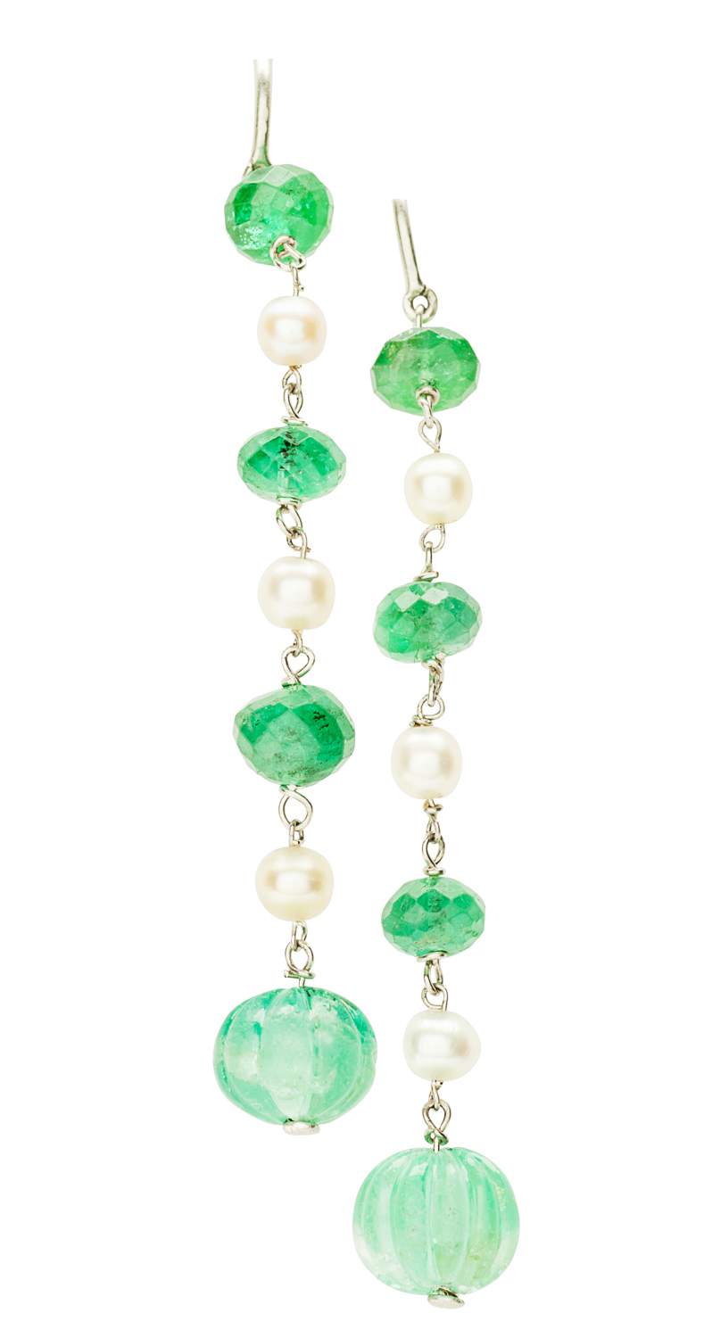 each set with four graduated carved and facetted emerald beads, between three small pearls (untested), joined by white metal links, to hook fittings