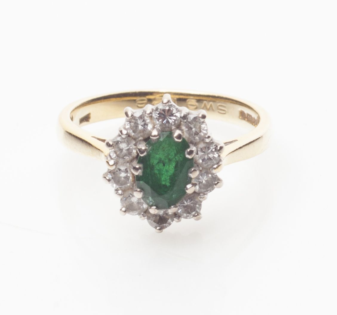 claw set with an oval cut emerald in a single border of small round cut diamonds, to a plain 18ct gold shank