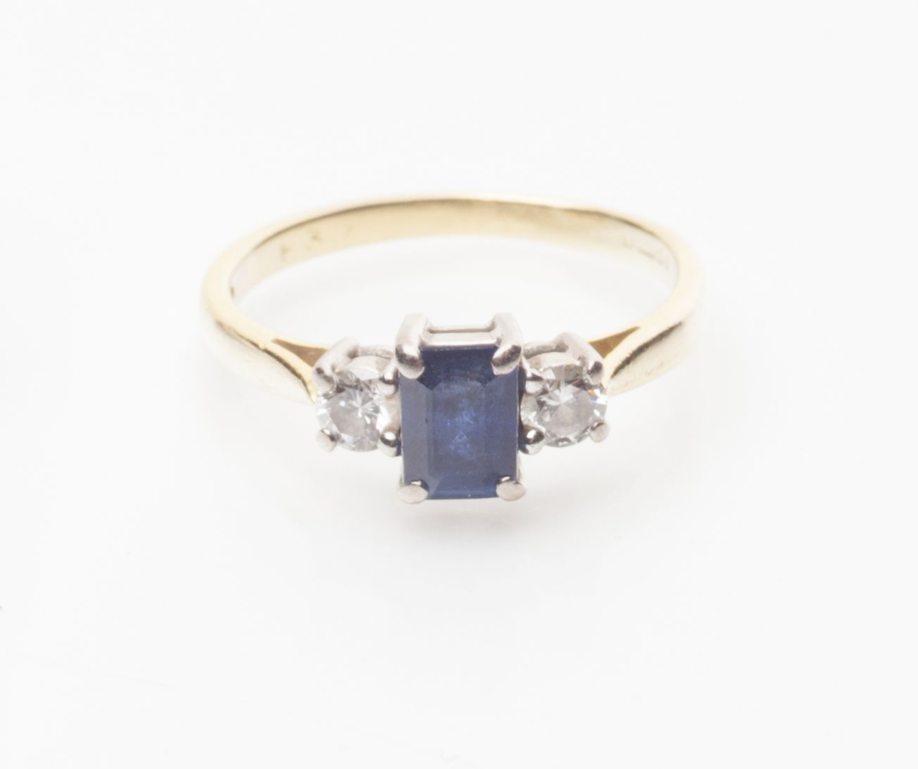claw set with a single trap cut sapphire, flanked to either side by a round brilliant cut diamond, to a plain 18ct gold shank
