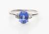 the oval sapphire of vivid blue and with two baguette cut diamonds to each shoulder, to a plain 18ct white gold shank