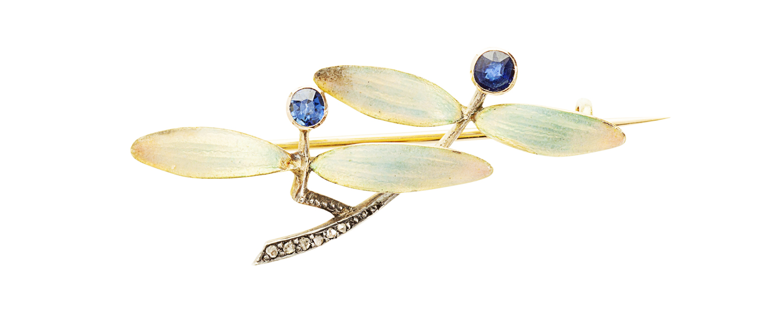 modelled as a floral spray, the leaves with enamel detail, collet set with two round cut sapphires and small diamond chips
