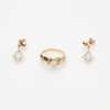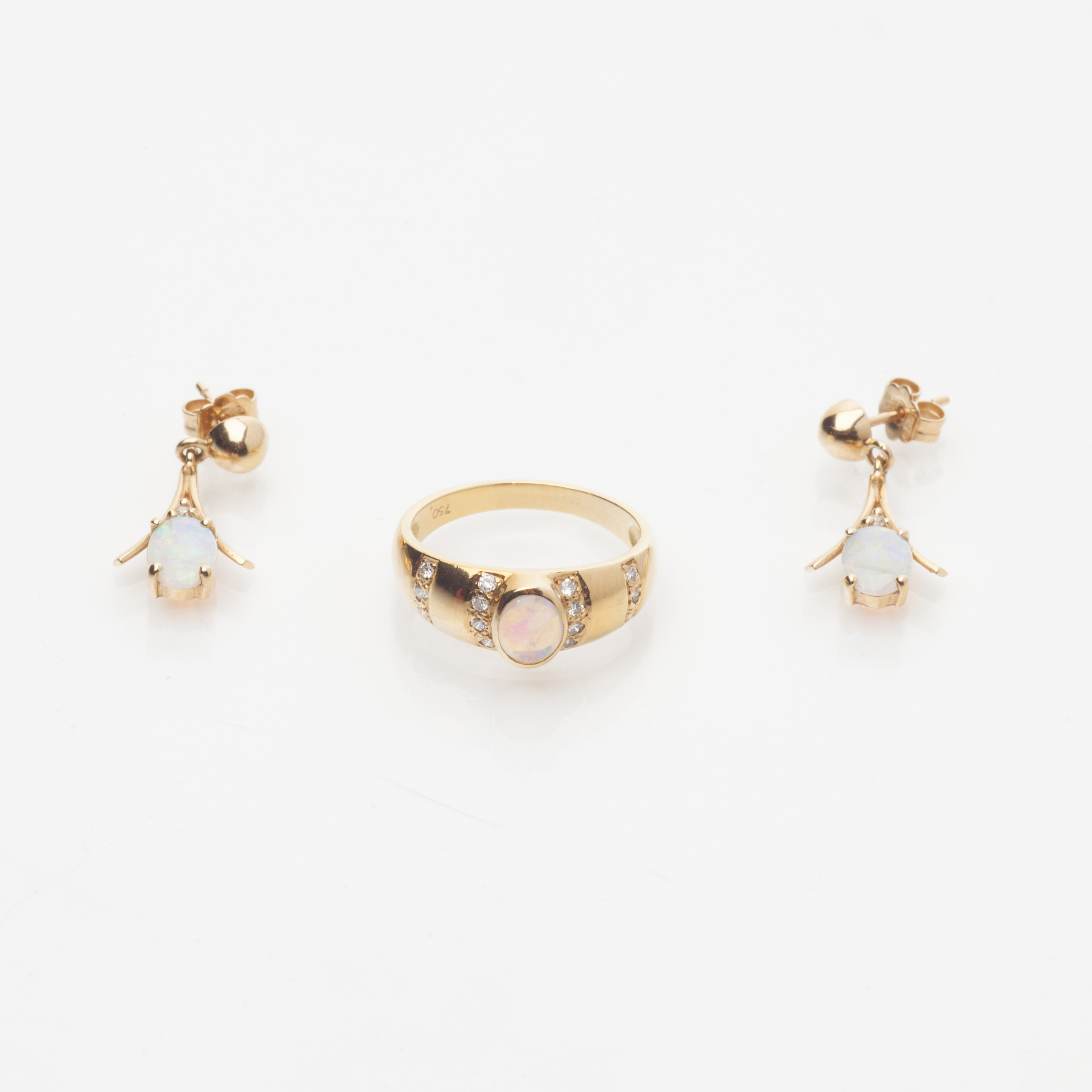 the ring with oval opal in rubover setting and two rows of circular cut diamonds to each side on the tapering band, stamped 750; the pendant earrings suspended form a post and ball fitting, slight flared bifurcated arms with claw set oval opal in between (2)