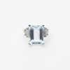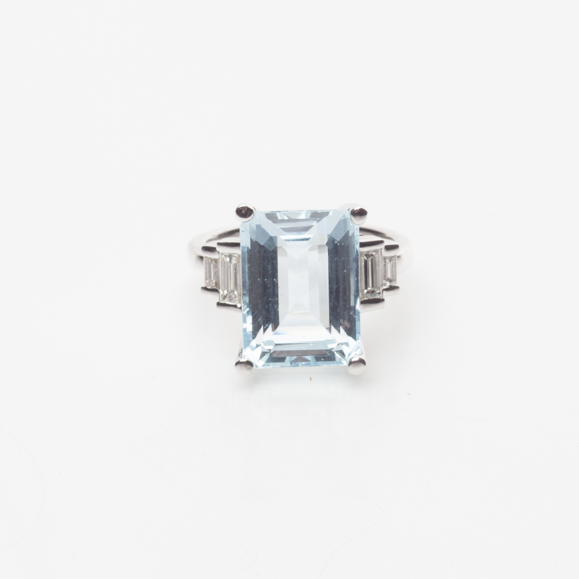 the rectangular cut aquamarine corner claw set, of good colour, within open mount and two baguette cut diamonds to each shoulder, to a plain 18ct white gold shank
