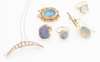 to include an opal crescent brooch, set in yellow metal with graduated circular opals, with a fine link yellow metal chain; two opal brooches, both set in unmarked yellow metal; three yellow metal rings, stamped 9ct and 14K, set with opal doublets and triplets (6)