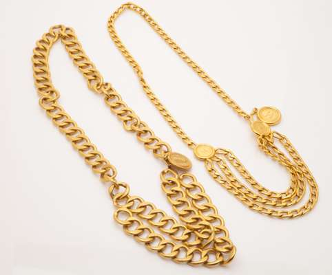 composed of large squared flattened curb links in gilt yellow metal, with S hook fastening, and with another similar modelled in white metal; together with a gilt metal Chanel belt, composed of flattened curb links and monogrammed medallion detail; and another similar composed of textured over sized curb links (4)