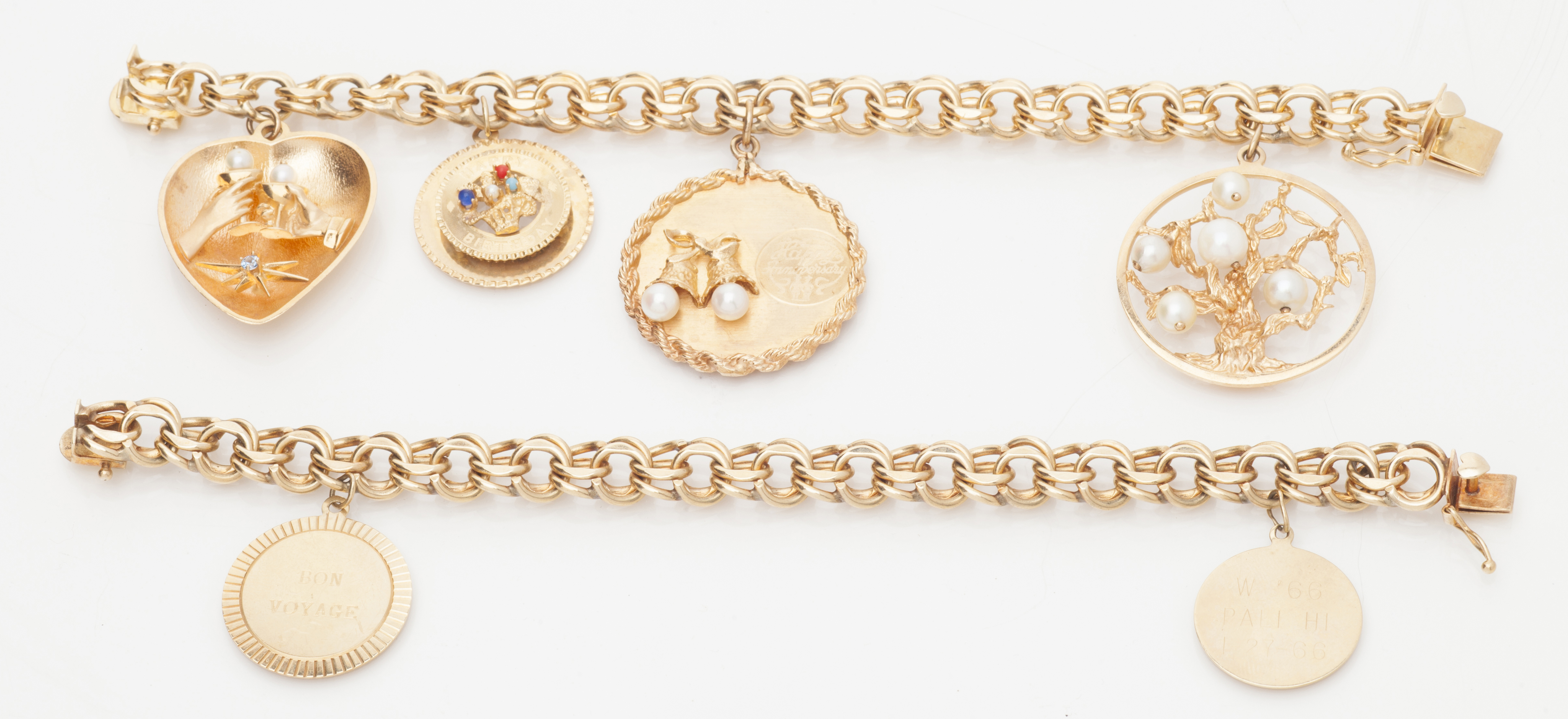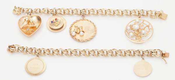 the broad double interlinked curb link chains with several large charms, engraved and gem set