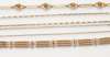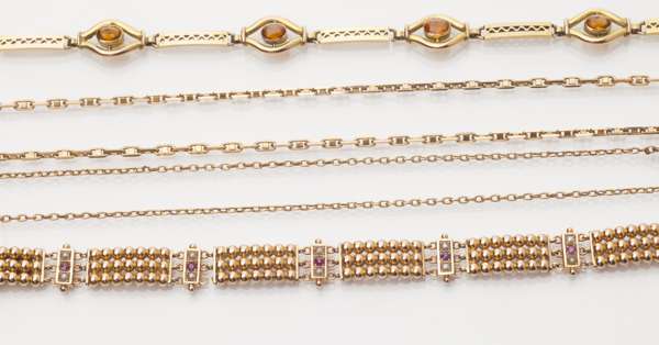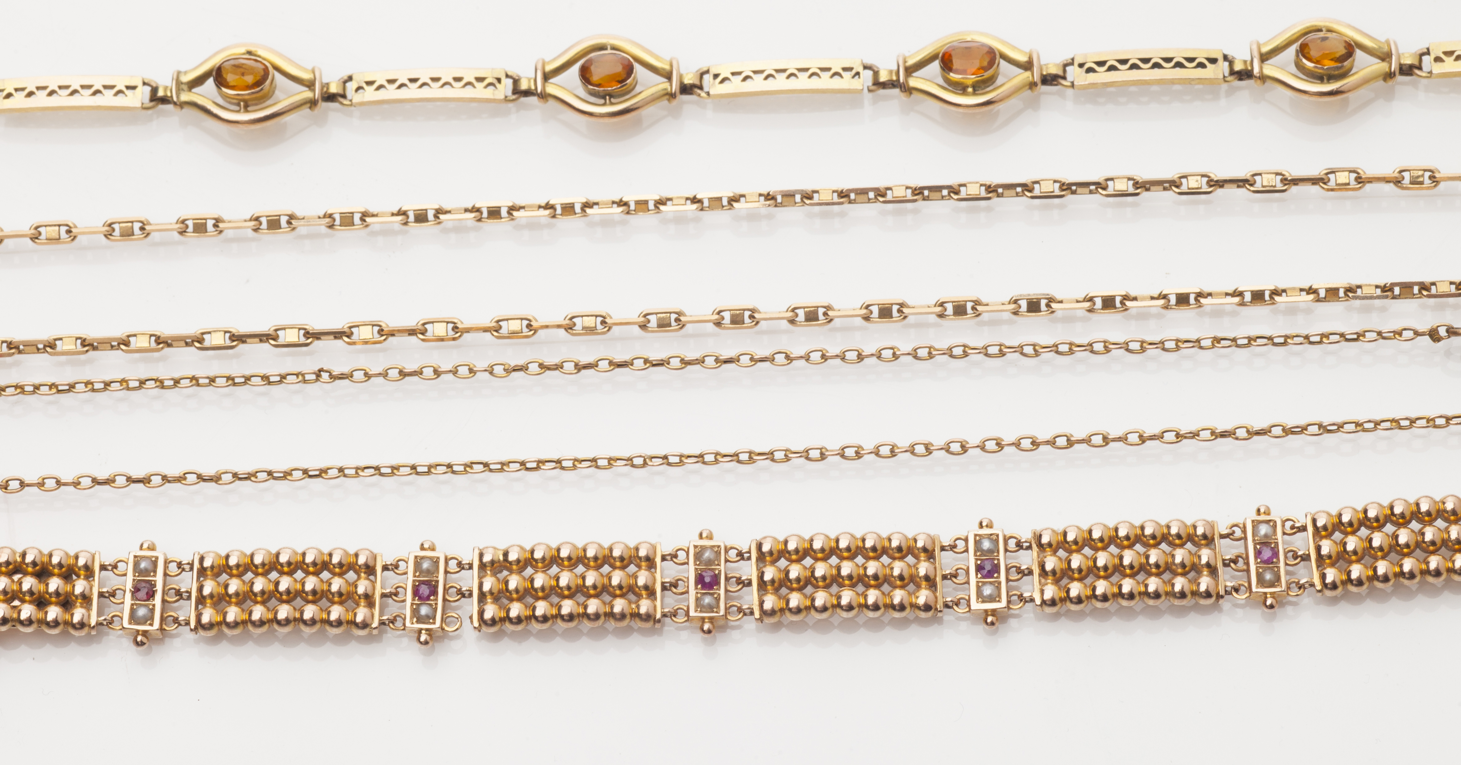 composed of alternating pierced rectangular and oval links, collet set at intervals with oval citrines, unmarked; together with a a yellow metal fancy link necklace stamped 14CT; a yellow metal fine belcher link chain stamped 9ct; a seed pearl and ruby set bracelet, composed of alternating gem set links and rectangular beaded links (4)