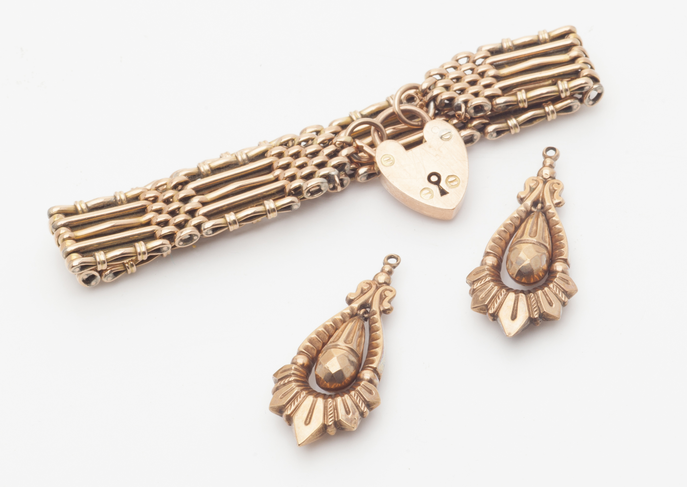 of conventional form with padlock clasp, stamped 9ct; together with a pair of 9ct gold pendant earrings, with prominent registration mark to inner suspension (2)