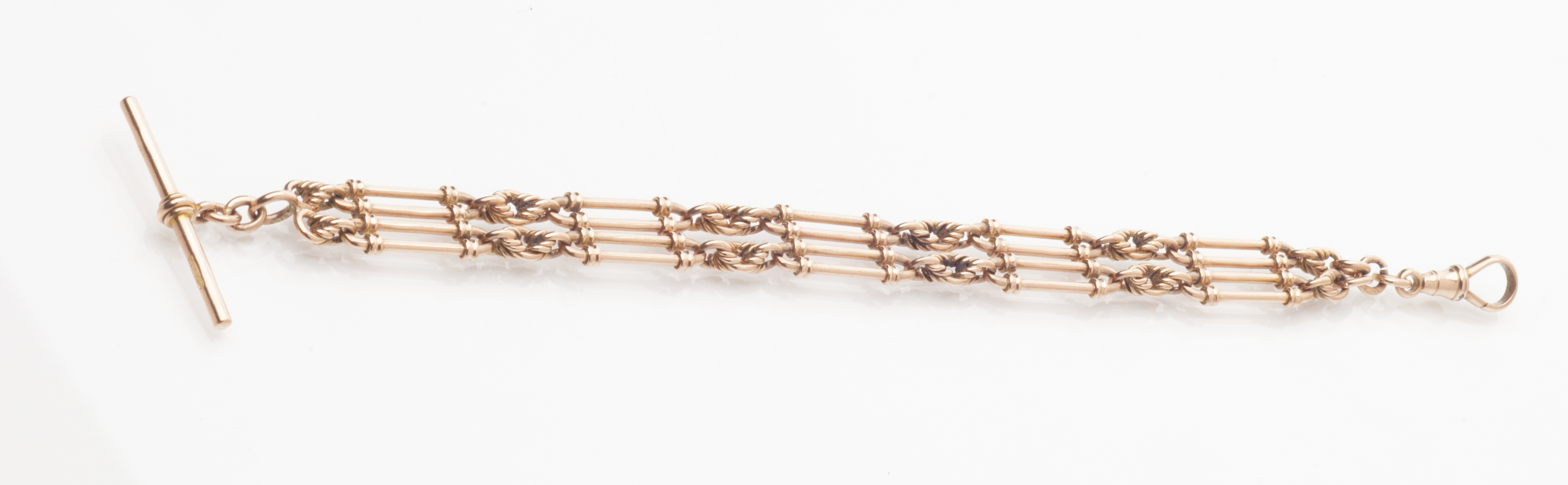 composed of two strands of alternating fancy and elongated oval links, with T bar suspension