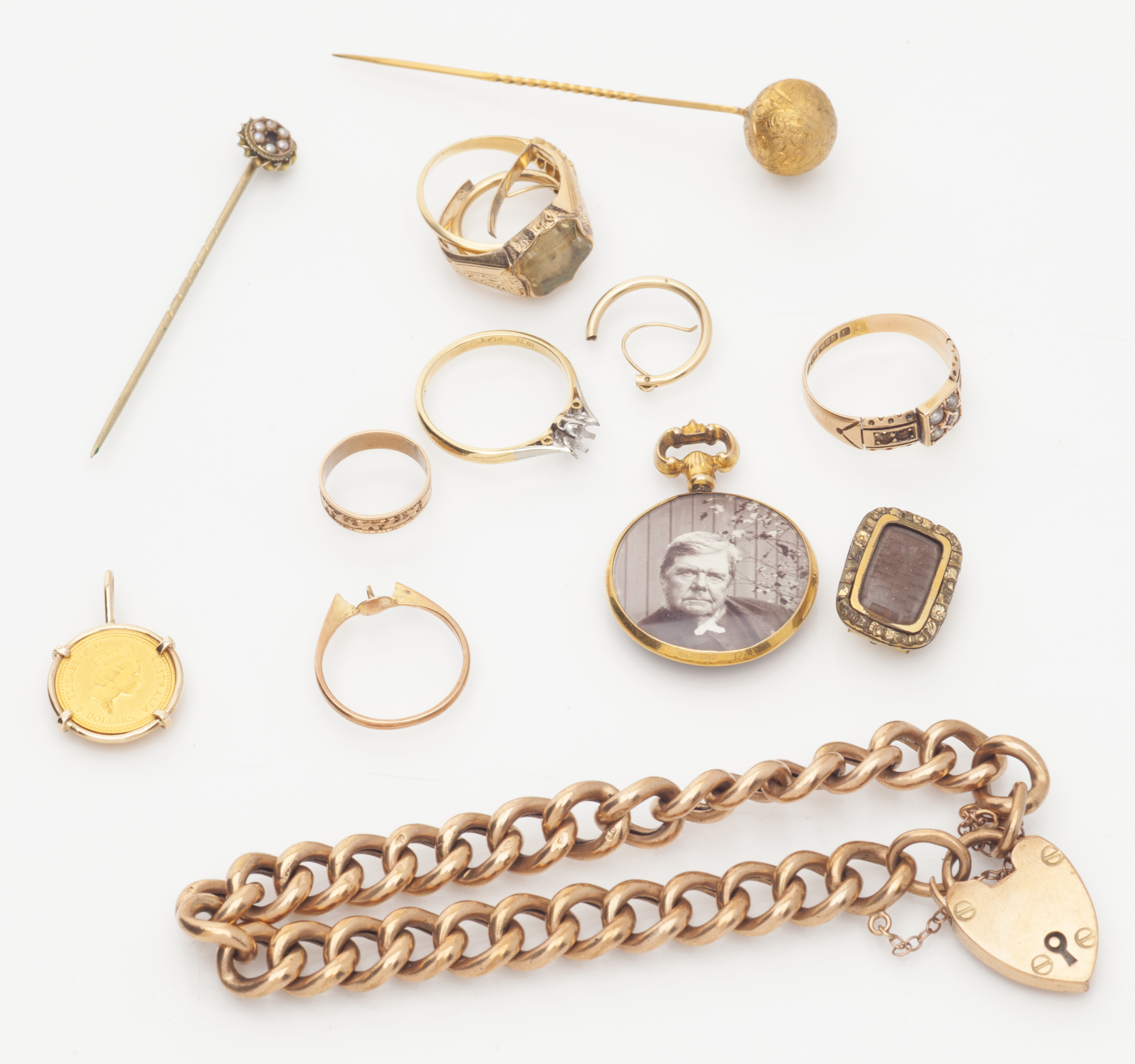 to include a 9ct gold curb link bracelet with padlock clasp; two yellow metal ring shanks, stamped 18ct and 9ct, a small yellow metal ring stamped 14; a 15ct gold seed pearl and ruby set ring; a small Australian nugget pedant; a collection of unmarked yellow metal items including a pair of hoop earrings, two tie pins; a small brooch set with hair, two gem set rings, and a locket (qty)