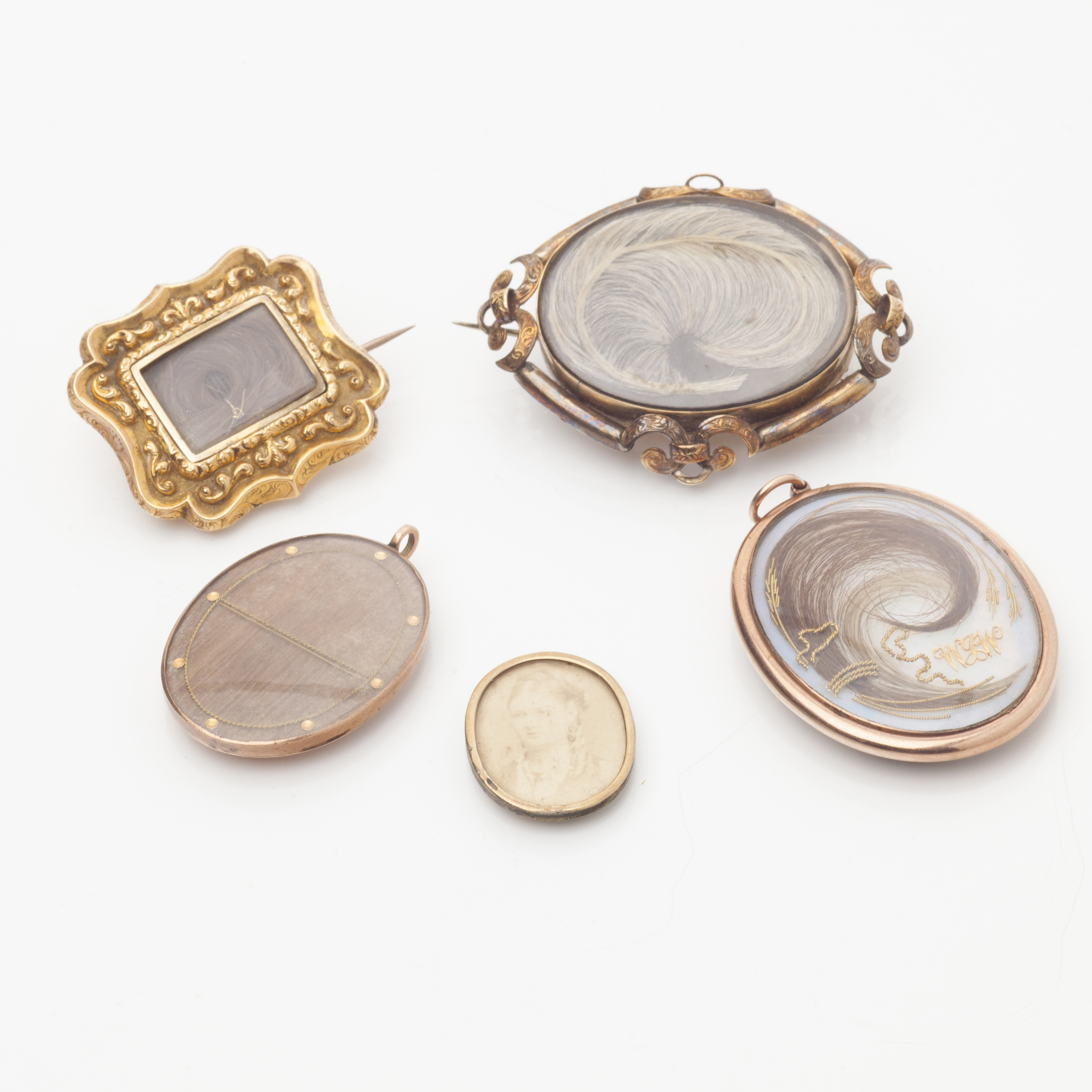 to include a late 18th century silhouette signed Meirs, male head portrait, plain gold pendant frame with hair to rear; an early 19th century plaque brooch with scrolling frame plaited hair to front; an inscribed gold late 18th century pendant with hair, dated 1792 and 1791; a small photograph and one other gilt metal mourning brooch (qty)