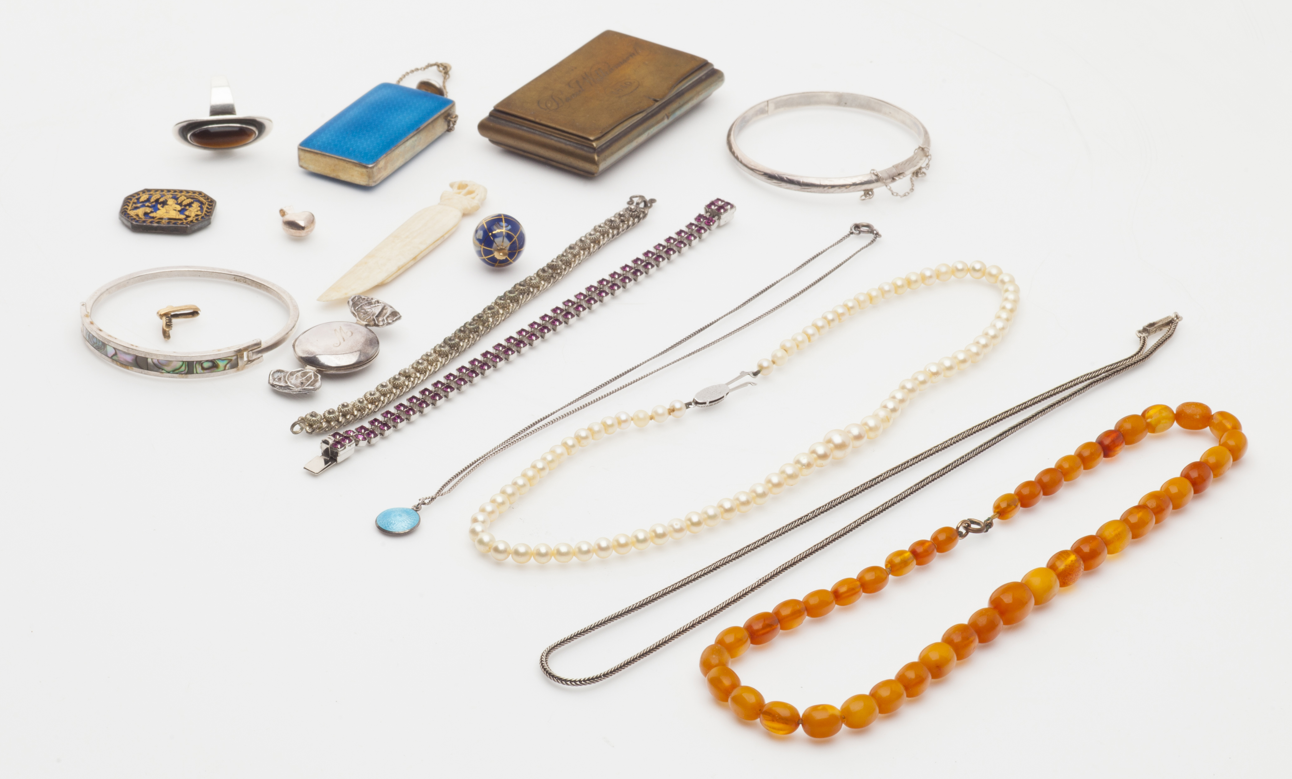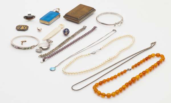 composed of a single strand of polished oval amber beads; together with a single strand of graduated cultured pearls; a mid 18th century brass snuff box; an enamel and gilt metal scent bottle; a small early 19th century Indian and gold enamel plaque (mounts missing) and other costume jewellery (qty)