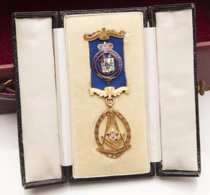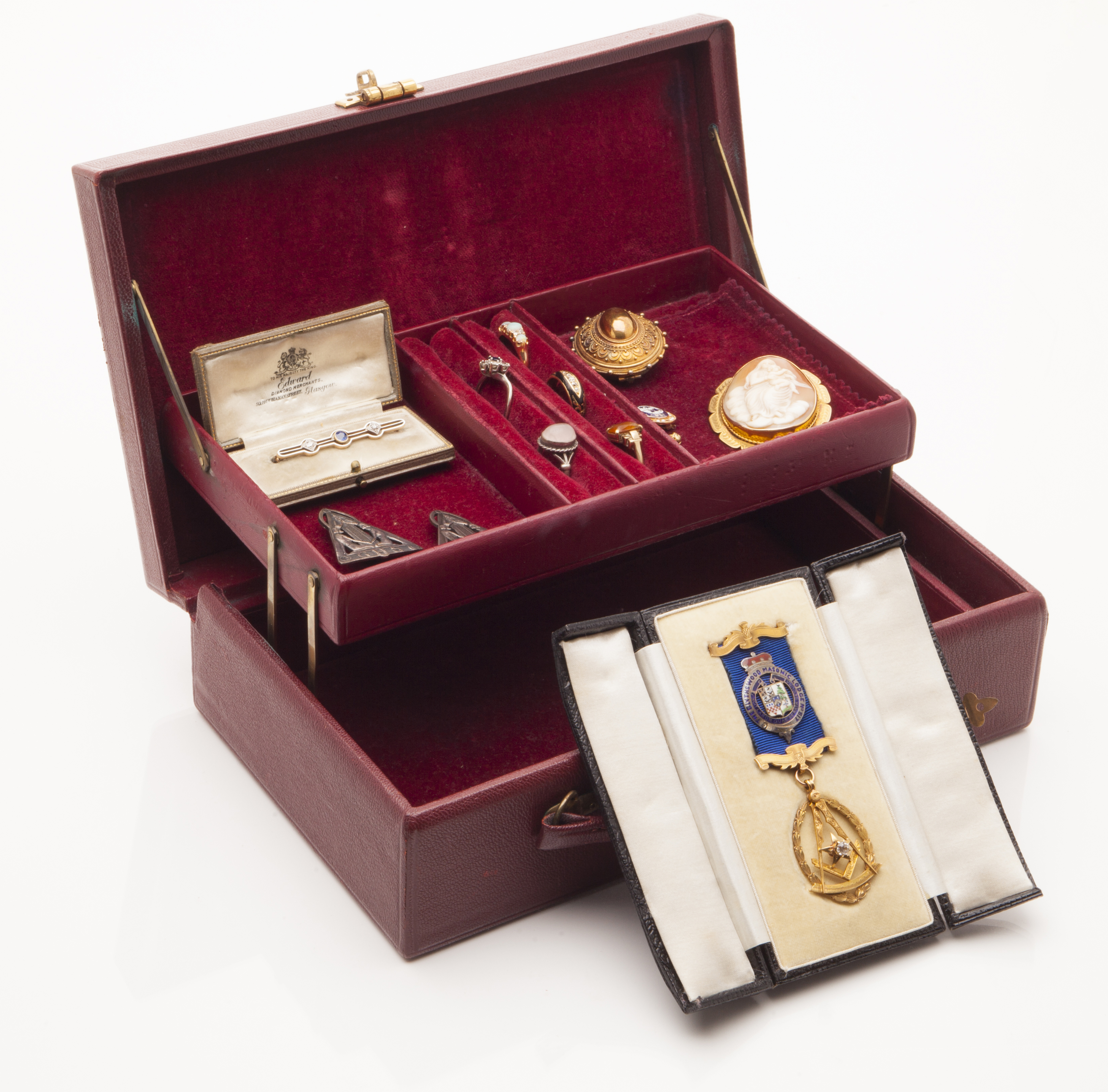 to include a 9ct gold masonic medal from the Blythswood masonic lodge, set with a small round cut diamond and enamel detail, in a fitted box; a silver Glasgow High School badge; a yellow metal, enamel and gem set Altrusa International badge; a large yellow metal Victorian brooch with glazed panel to rear, a yellow metal mounted shell cameo brooch; a white metal diamond and sapphire set bar brooch in a fitted box, a sapphire and diamond set cluster ring; an opal and diamond set ring; an 18ct gold black enamel and diamond set mourning ring, two other gem set rings, in a red leather jewellery box (qty)