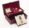 A collection of jewellery in a red leather jewellery box