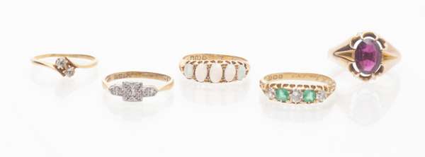 to include an 18ct gold emerald and diamond set ring, with three round cut diamonds and two emeralds; a 9ct gold amethyst set ring; a yellow metal and small diamond set cross over ring, a yellow metal five stone diamond ring, stamped 18ct & PLAT; an 18ct gold ring set with five oval opals (5)