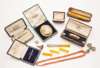 to include a turquoise set brooch, of bow form with engraved scrolling detail, glazed panel to rear of pendant; an amethyst and seed pearl set brooch, of pierced design; a small seed pearl set heart pendant; a cameo brooch depicting two Grecian figures in profile; a yellow metal and hardstone seal; a coral necklace; various amber and white metal cigarette holders; a pair of pearl set studs; a yellow metal brooch (qty)