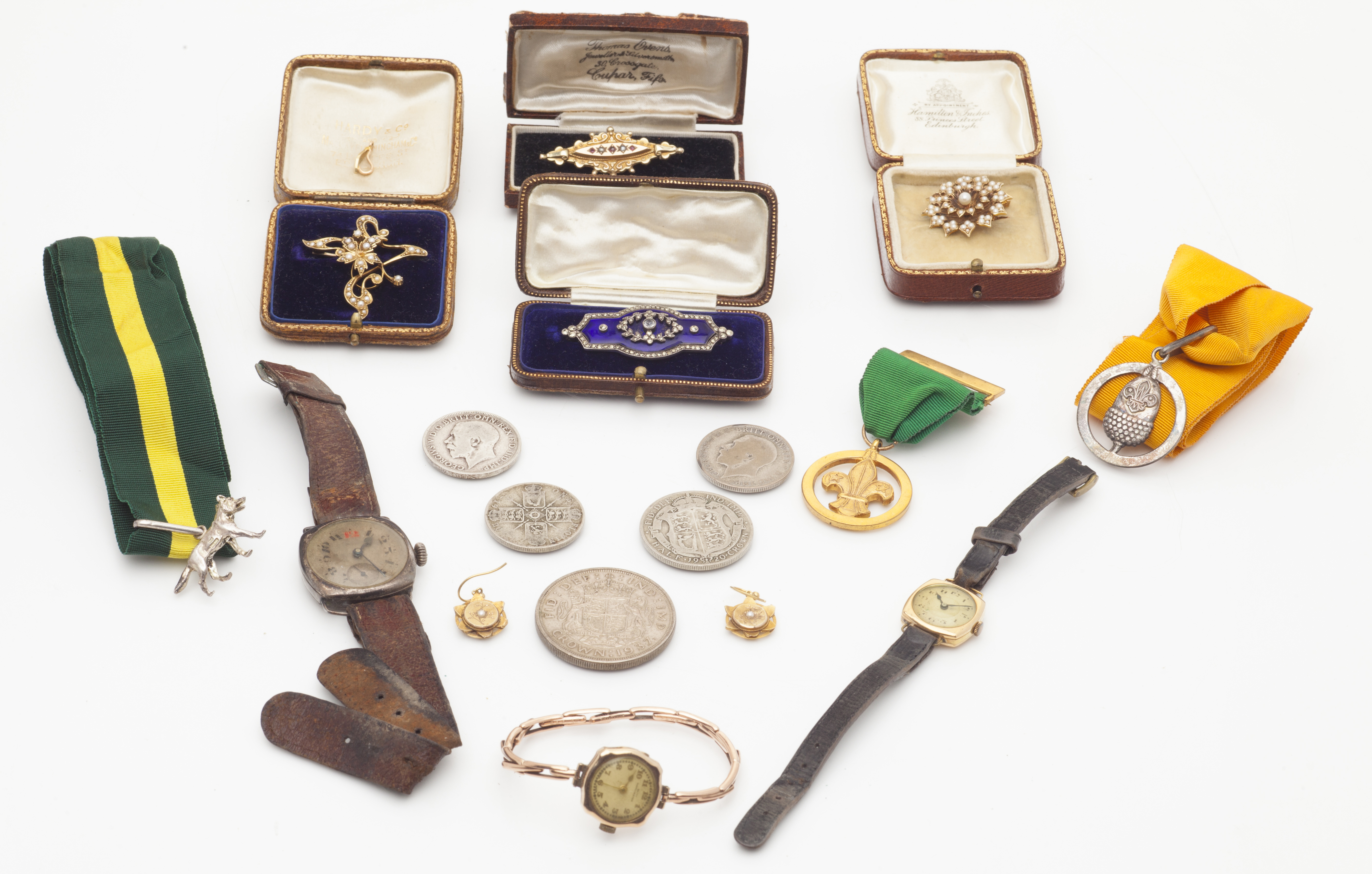 to include: a Victorian ruby and pearl set bar brooch, an Edwardian pearl set pendant brooch of scrolling foliate design, a pearl set pendant of floral form, a pair of small pearl drop earrings, an enamel and paste set plaque brooch, Scout medals including Fox, various coins, silver cased military style wrist and other watches etc. (Qty)