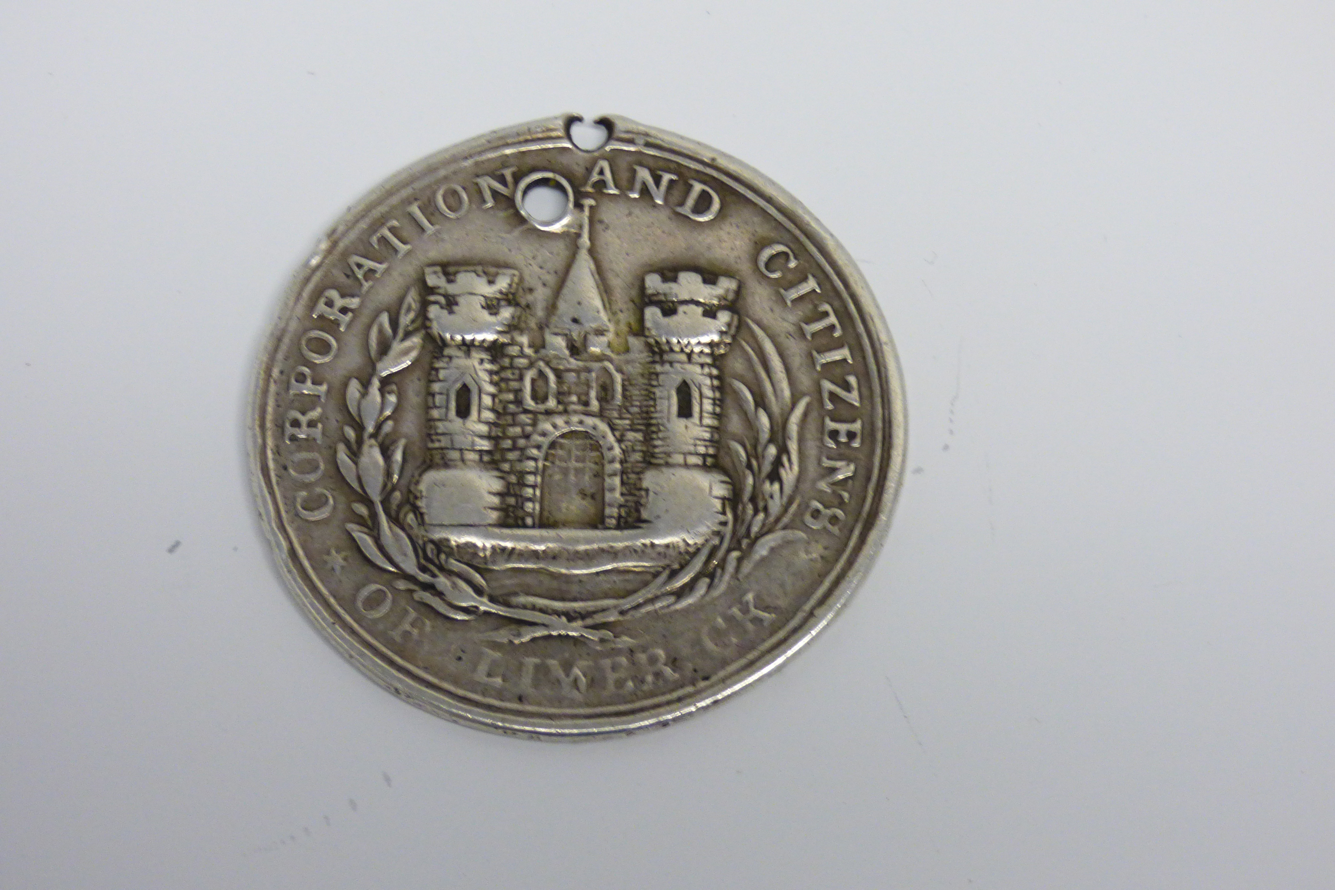silver, unmarked, with crown in laurel wreath and inscribed, the reverse with The Corporation and Citizens of Limerick and building facade