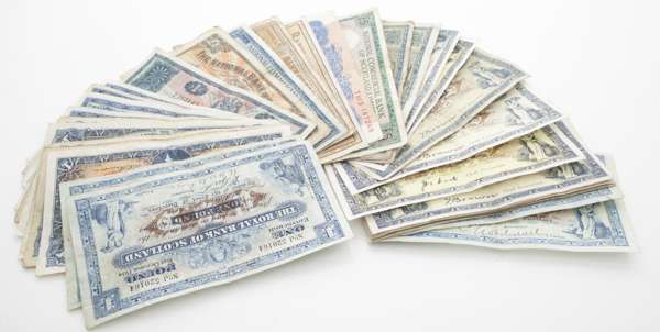 to include various £1 issues for British Linen Bank, Commercial Bank of Scotland, Royal Bank of Scotland, North of Scotland Bank, Bank of Scotland, National Commercial Bank of Scotland, National Bank of Scotland; together with a 1961 issue National Commercial Bank of Scotland £5 (qty)