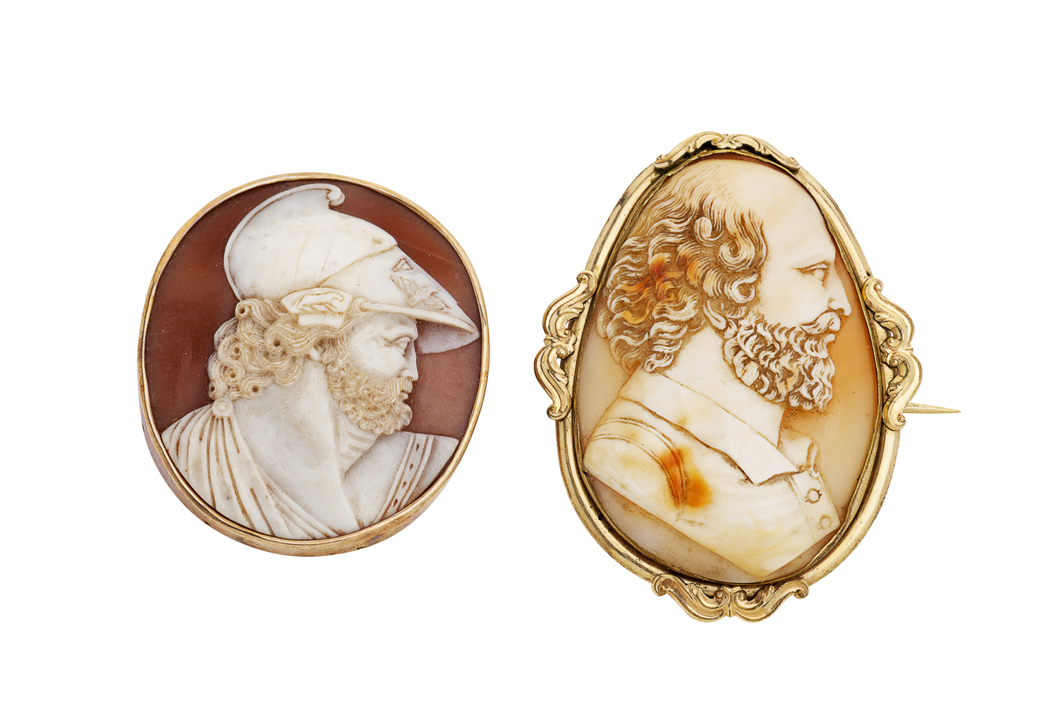 one depicting a hirsute gentleman, possibly Shakespeare; the other in plain gold slip mount, of a Grecian warrior (2)