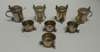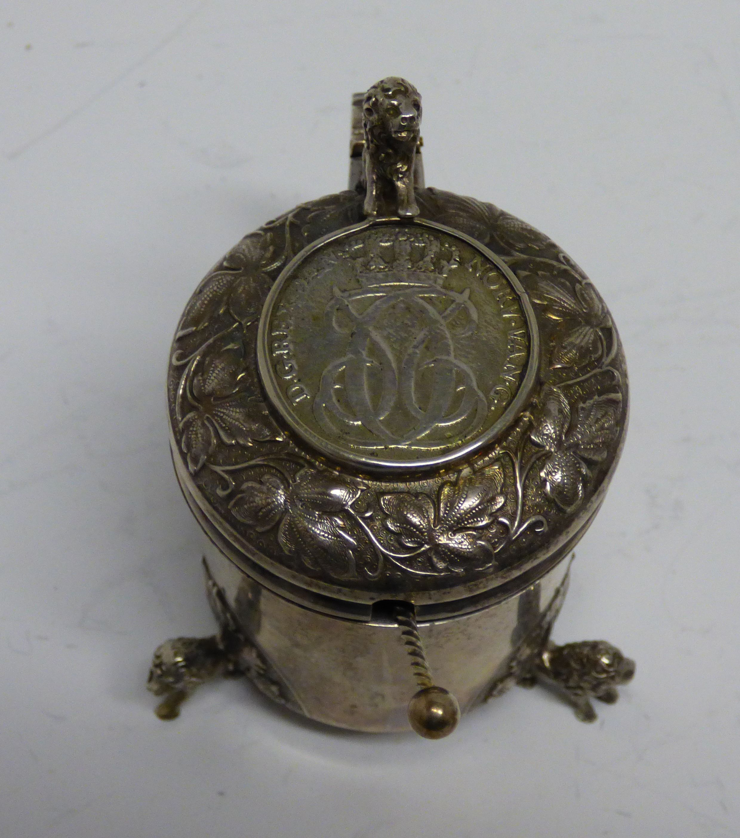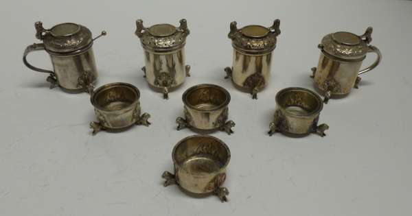 830 standard, circa 1880, comprising two lidded mustard pots, two large pepperettes, four open salts, the mustards and peppers modelled as lidded tankards, inset 1742 Skilling coins, chased borders, lion mask thumbpieces, plain cylindrical bodies, chased leaf detail to the seated lion feet, the salts similar but open form, with associated spoons
