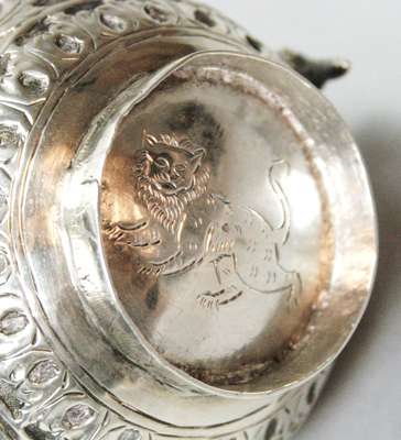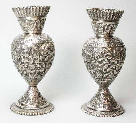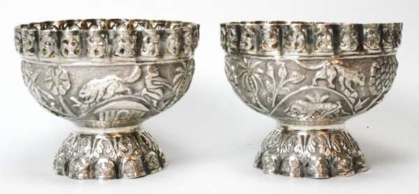 all unmarked, to include a pair of dishes, pair of spill vases, double measure and cream jug, all profusely chased with scrolls and animal etc (6)