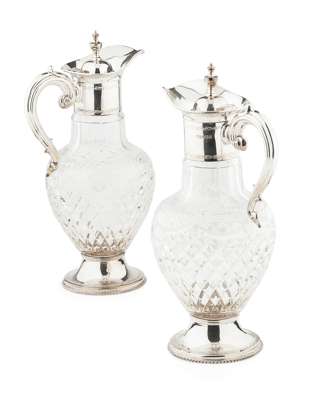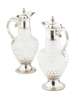 A pair of cut glass silver mounted claret jugs