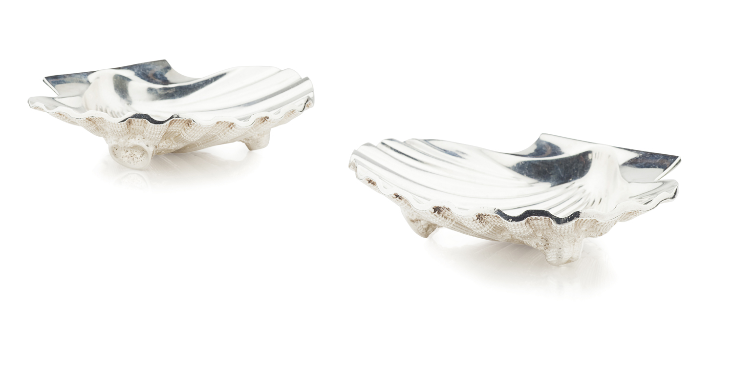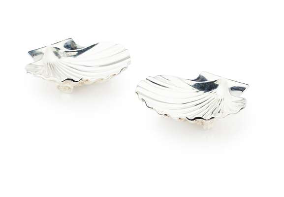 London 1989, of traditional form of cast scallop shells with shell feet, the interiors plain, additionally engraved 'reproduction 1732 Paul Lamerie' (2)