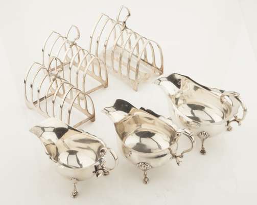 to include a pair of toast racks, of rounded triangular form, Roberts & Belk, Sheffield 1974, and another similar; a matched set of three graduated sauce boats, of plain design with scalloped rim, various dates and makers (6)