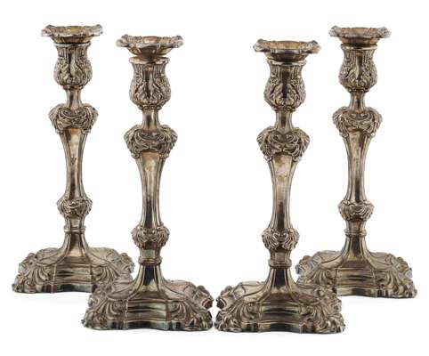 HM, London 1972, the knopped tapering square stem with acanthus leaf detail, to a stepped square foot of similar design, with matching shaped square sconces (4)