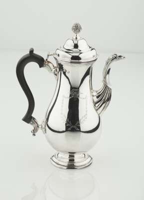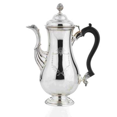Royal Irish Silver, Dublin 1968, of simple baluster form with engraved harebell cartouche and fluted scroll spout, wooden handle and hinged cover
