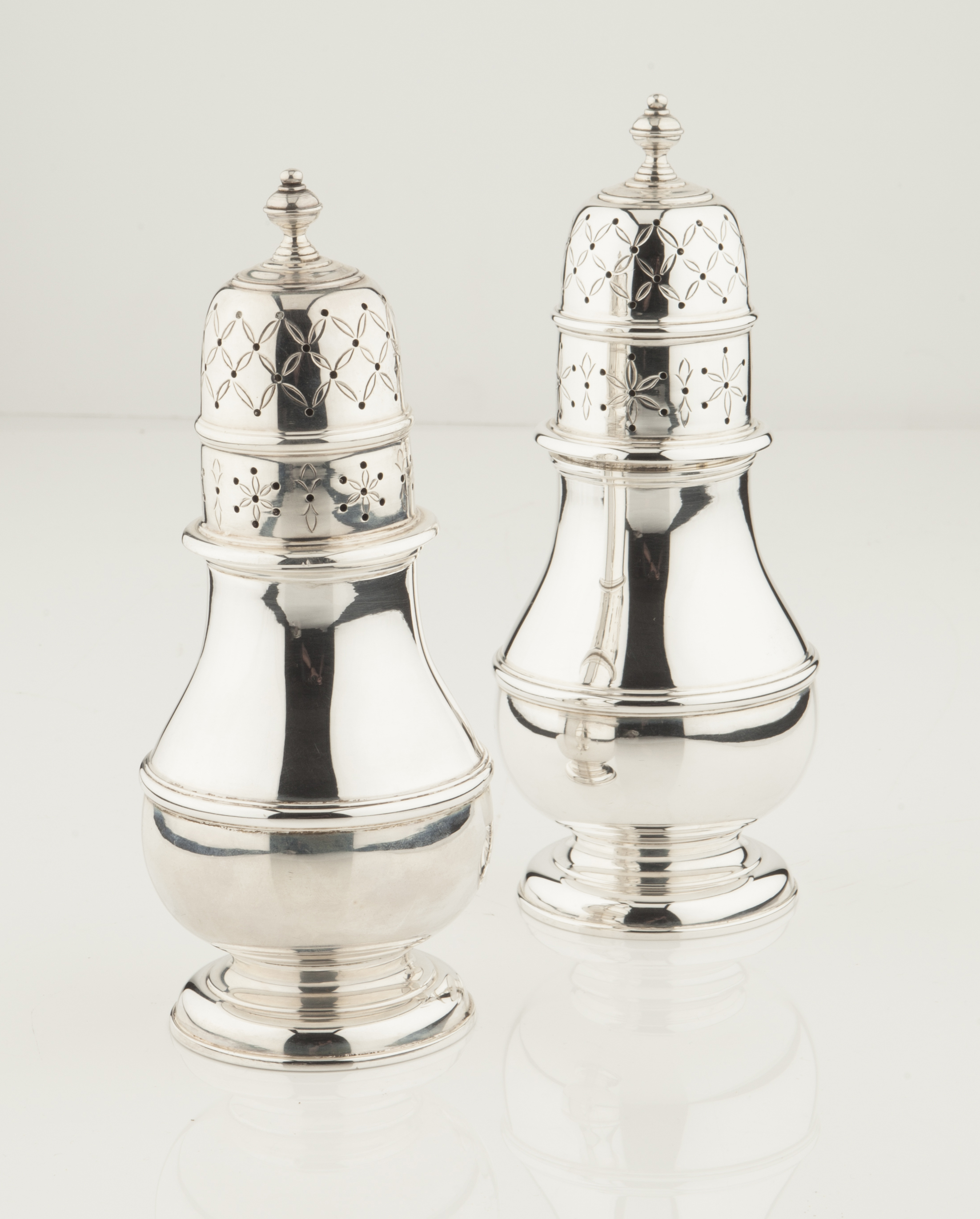 London 1962, the plain baluster body with reeded detail at rim and mid-section, domed foot, the domed pull off cover with pierced and engraved detail (2)