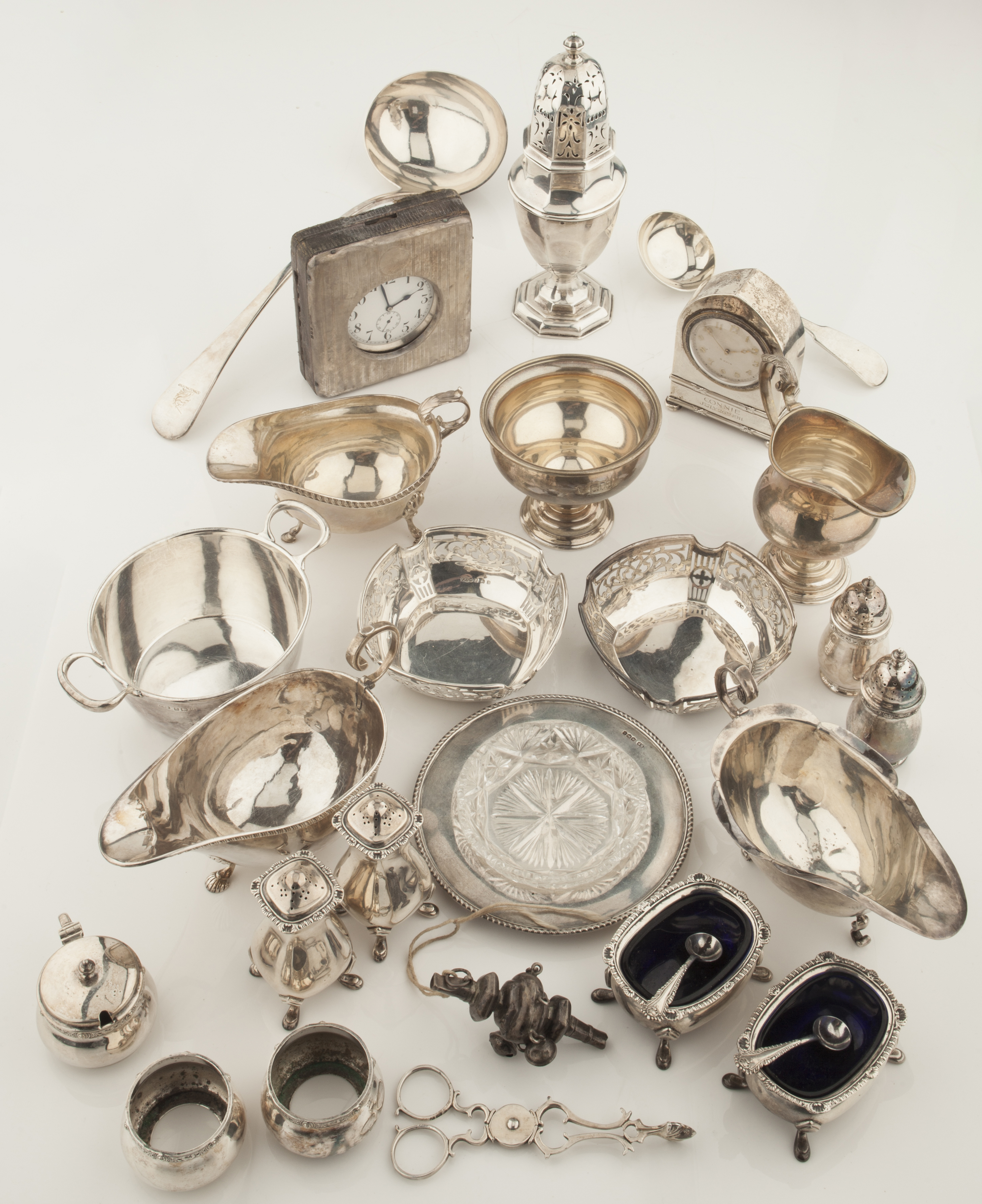 to include various sauce boats, a pair of pierced dishes; two pepper pots, a twin handled bowl; a large sugar caster, various ladles; two silver cased mantle clocks; a babies rattle, a pair of sugar nips; a matched condiment set (qty)