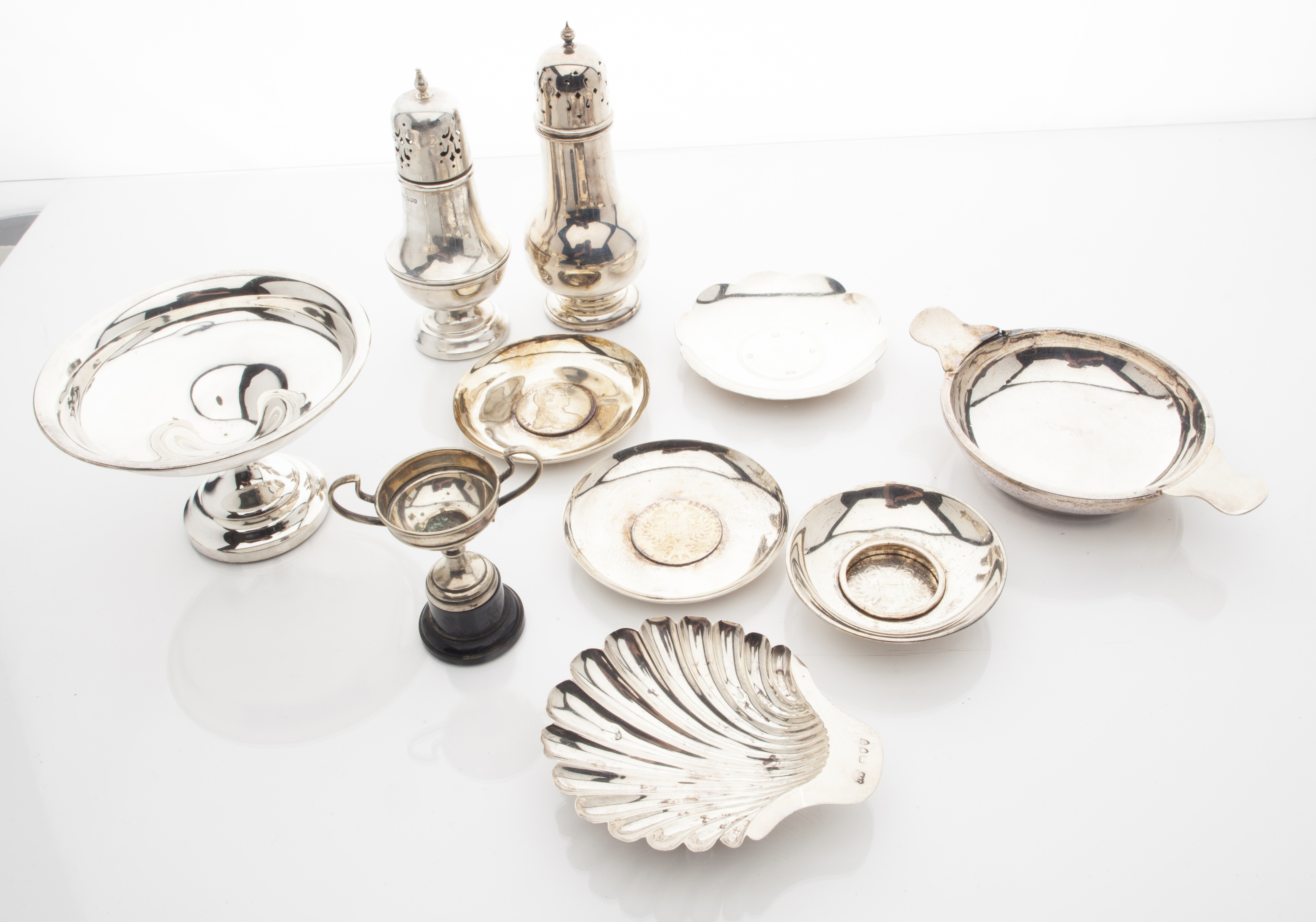 two baluster sugar casters, a shell shaped dish, a two handled dish a/f, three pin trays two with inset coins, small trophy and a comport