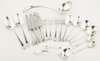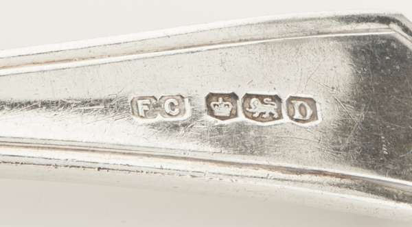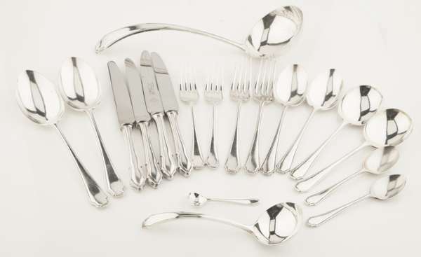 Frank Cobb & Co Ltd, Sheffield 1946, comprising six table spoons; twelve table forks; twelve dessert spoons; eleven dessert forks; twelve soup spoons; six teaspoons; a soup ladle; two toddy ladles; three salt spoons, all of angular threaded design; together with twelve table knives, twelve side knives of similar pattern, and twelve teaspoons of shell pattern (qty)