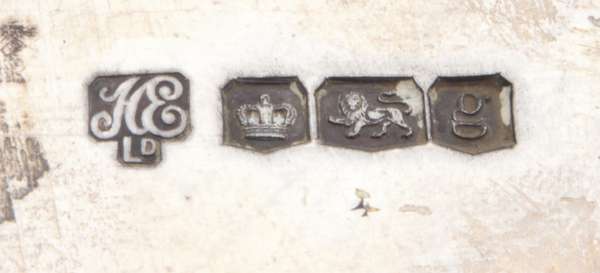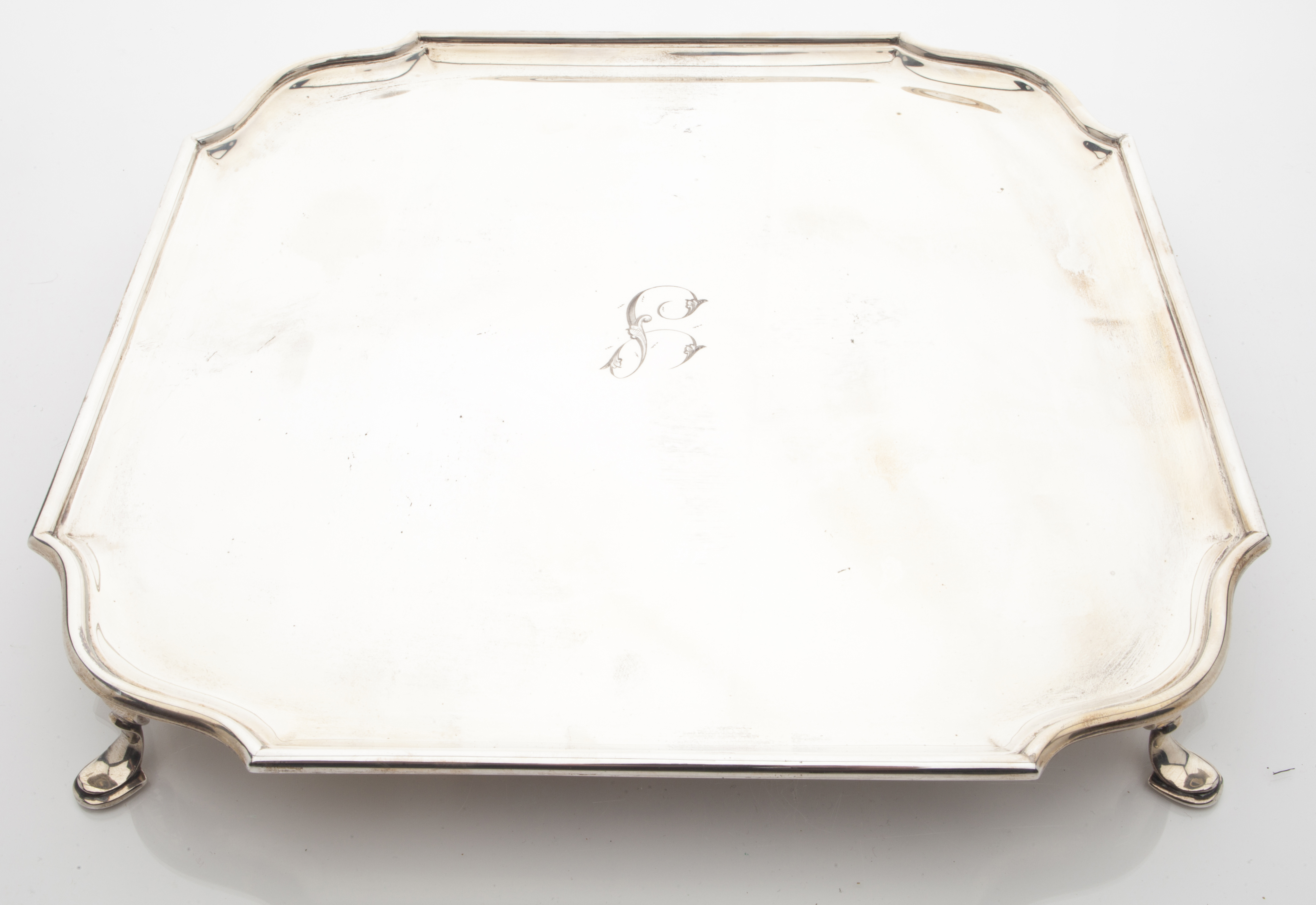 HE, Sheffield 1940, of square form, re-entrant corners, engraved initial, raised on cabriole legs with hoof feet