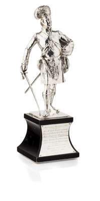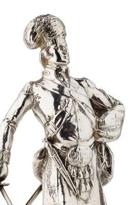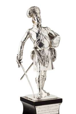 Elkington & Co, Birmingham 1924, the standing figure of a Seaforth Highlander officer in full dress uniform, on a black ebonised base with applied presentation plaque, in fitted travel box