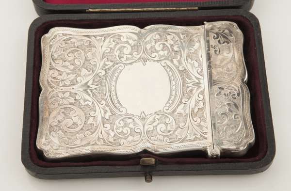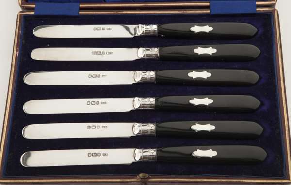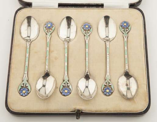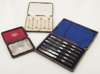 to include a cased set of butter knives, the silver blades to black plastic handles, Sheffield 1910; a cased set of coffee spoons with enamel floral detail; a card case in presentation box, of scalloped outline with engraved foliate detail (3)