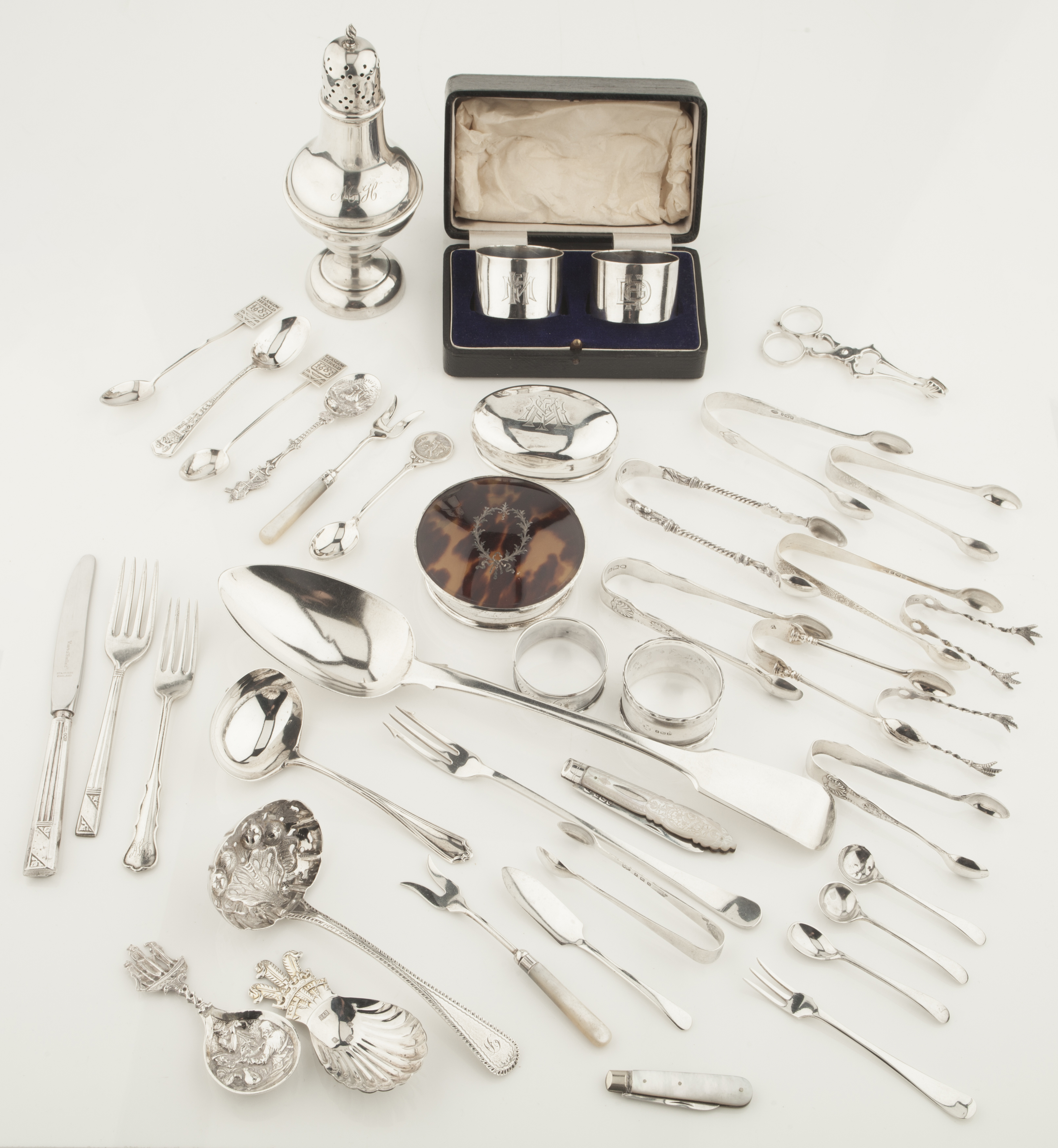 to include an Edwardian sugar caster of plain bellied form, Birmingham 1909; a large fiddle pattern serving spoon; two napkin rings; a silver mounted tortoiseshell box lid; a cased pair of napkin rings with engraved initials; various sugar tongs, caddy spoons and other flatware (qty)