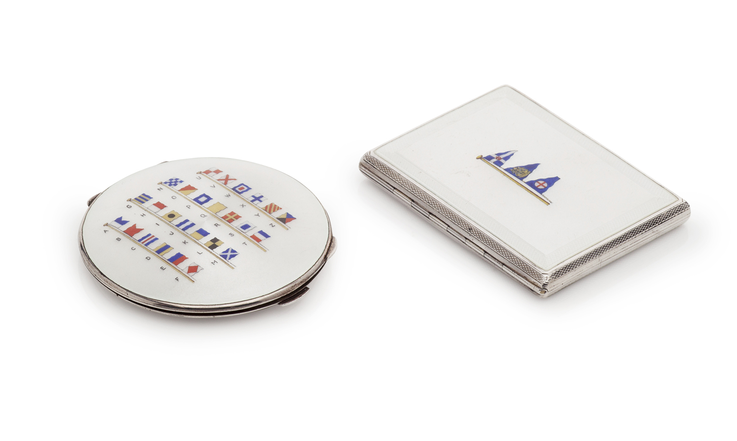 the circular compact, J W Benson, Birmingham 1948, the hinged cover with enamelled and engine turned cover decorated with the International Code of Flag Signals; the rectangular compact, J W Benson, Birmingham 1947, engine turned ground and enamelled decoration to read Royal Thames Yacht Club, Royal Solent Club,