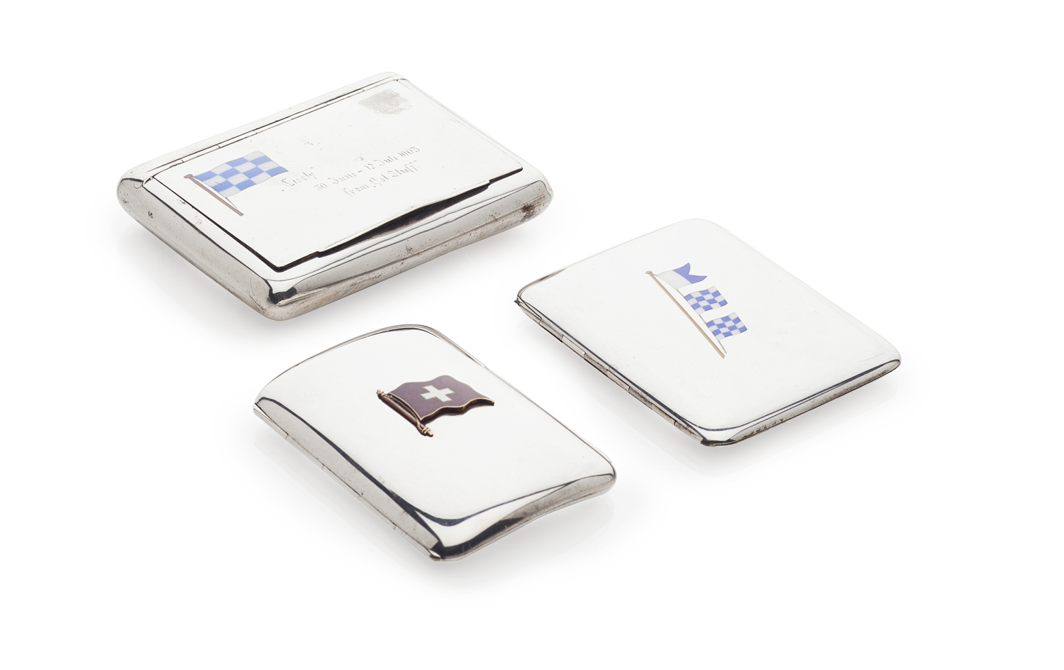 two of conventional curved form, Asprey, Birmingham 1961, decorated three signal flags spelling ANN; the second, Arthur & John Zimmerman, Birmingham 1927, applied brass and enamelled Swiss flag; the third, rectangular, hinged cover, 800 standard, the cover with enamel signal flag for N, and engraved "Cisely 30 Juni - 12 Juli 1903 From Hot Stuff"